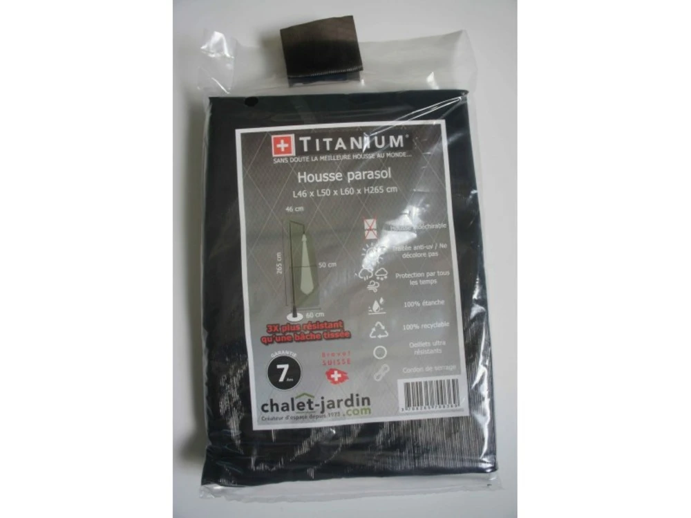 Techniquesdimensions ext. Hors tout (l x p x h) : 46 x 50 x 60 x 265 cmgrammage : 90 g/m ²matiã¨re : polyã©thylã¨necoloris : noir rayã© blancinclus : cordon de serrage ultra rã©sistantssouple et lã©gã¨re / 100 % recyclable / 100 % ã©tanche ã l’eau, ã la poussiã¨re et aux uv / rã©siste aux changements de tempã©ratures et ã de nombreux produits chimiquescolis dimensions : 40 x 30 x 40 cmpoids : 0,435 kgcette housse de protection pour parasol vous permettra de protã©ger votre parasol en le gardant au sec et ã l’abri des intempã©ries. Cette housse de protection bã©nã©ficie d’un procã©dã© ultrasonique pour une meilleure rã©sistance, systã¨me brevetã© (suisse).avantages : ultra rã©sistant, technologique, opaque, traitã© pour une protection uv, pratique, ne nã©cessite aucun entretien