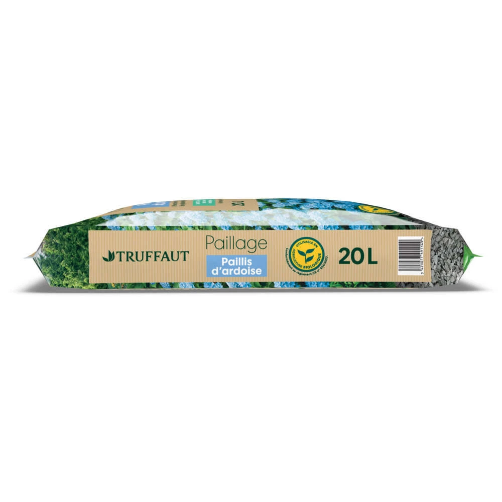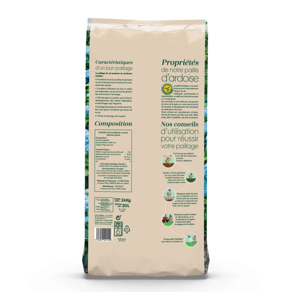Grâce à son poids et à l’imbrication des éléments, le paillis d’ardoise a une excellente tenue et limite nettement l’érosion du sol. Inaltérable, incombustible et imputrescible, ce paillis est très économique sur le long terme. Son pH acide le rend idéal pour les plantes de terre de bruyère et à pour particularité de favoriser le bleuissement des hortensias par libération d’alumine. Sélectionné pour son aspect ambré, ce paillis d’ardoise est unique et épouse la tendance du retour au naturel et aux matériaux bruts.