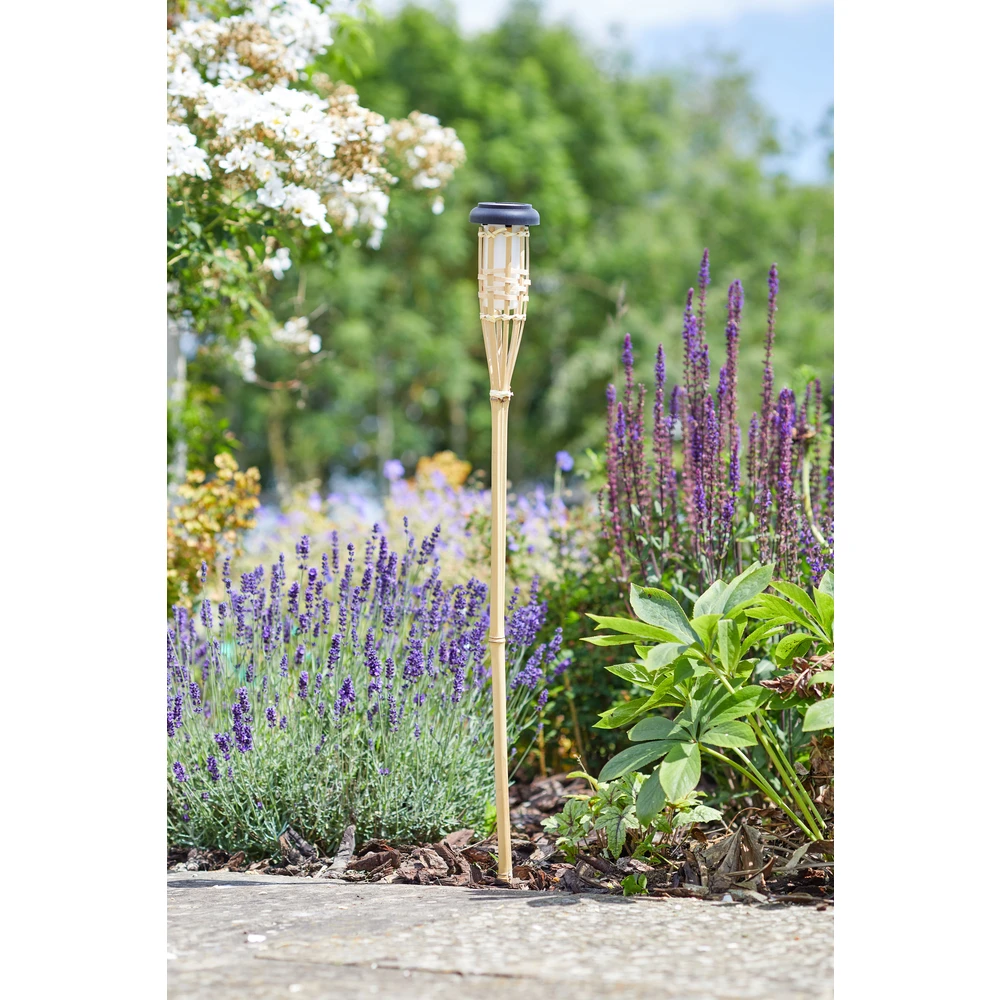 Torche solaire Bambou avec technologie Cool Flame pour un effet flamme vacillante réaliste et très branché, d’une couleur blanche chaude. Balise à planter le long des allées et bordures pour créer une atmosphère unique. Dimensions : L 8.5 l 8.5 H 91.5 cm
